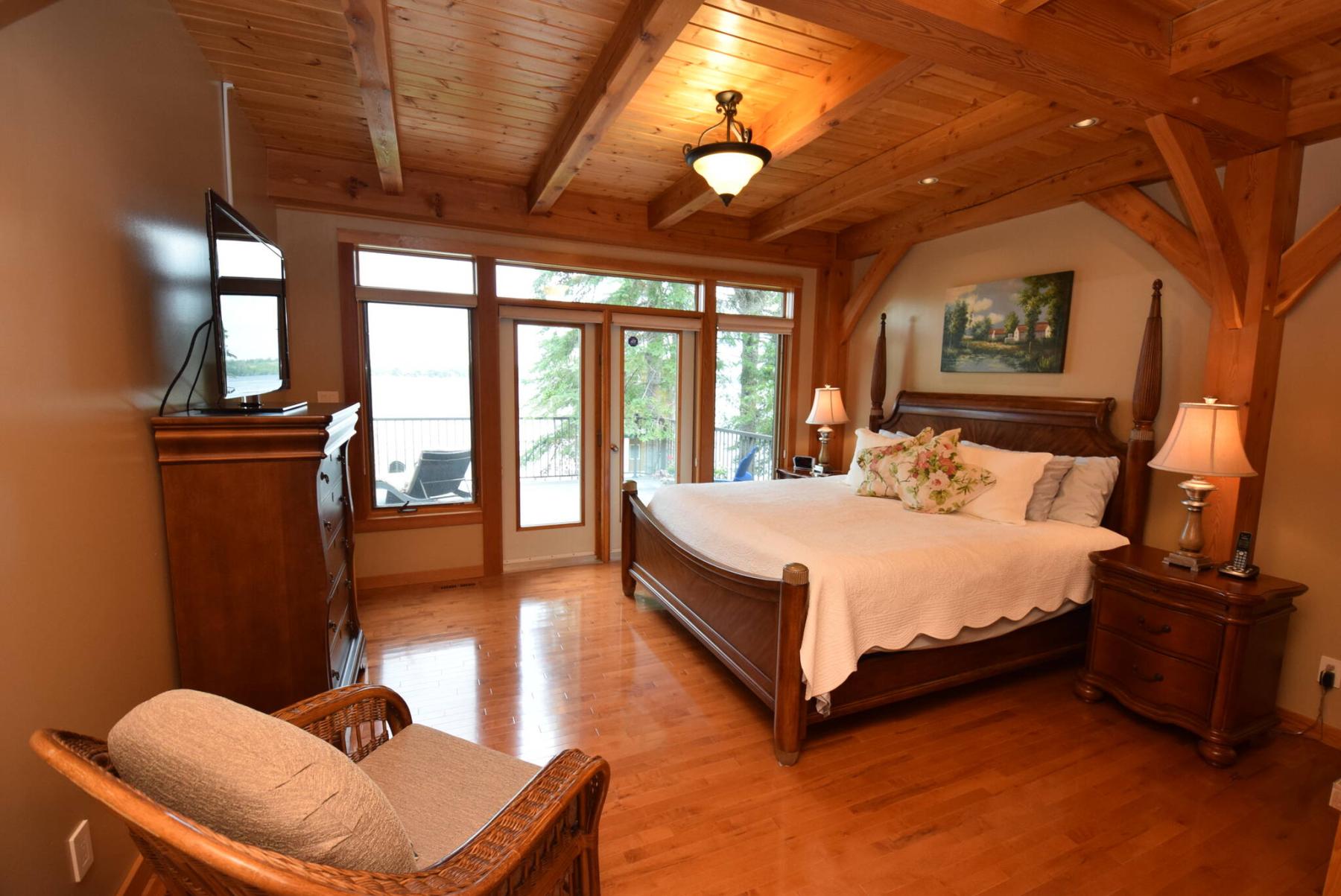 The spacious primary bedroom connects to a private deck overlooking the lake.
