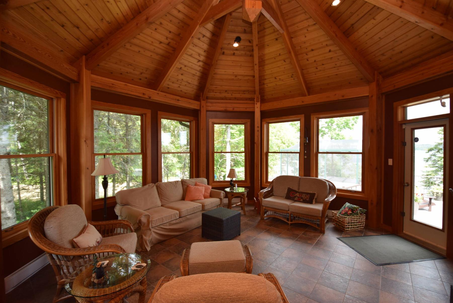 Surrounded by nine windows, the sunroom is a serene, spectacular space that faces directly onto the backyard and lake.