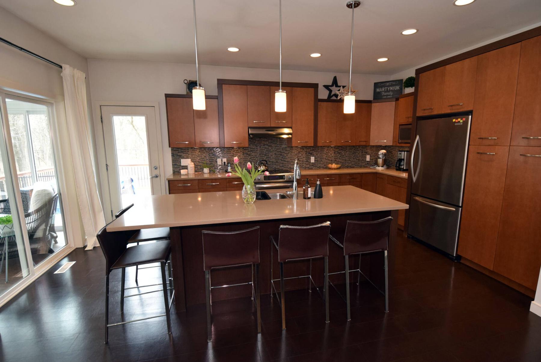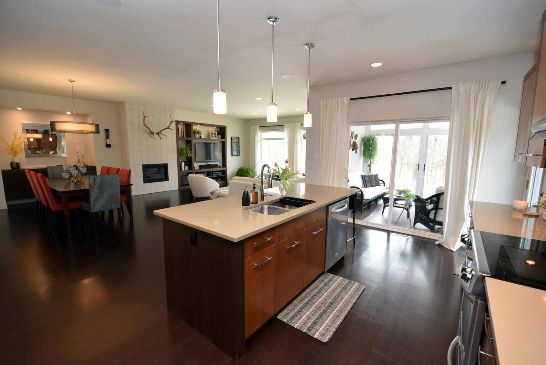 “At its centre is a perfectly sized island that seats five,” she says. “It offers Caesarstone countertops, awesome two-tone maple cabinets, a tile backsplash, pantry next to the fridge and stainless-steel appliances.”