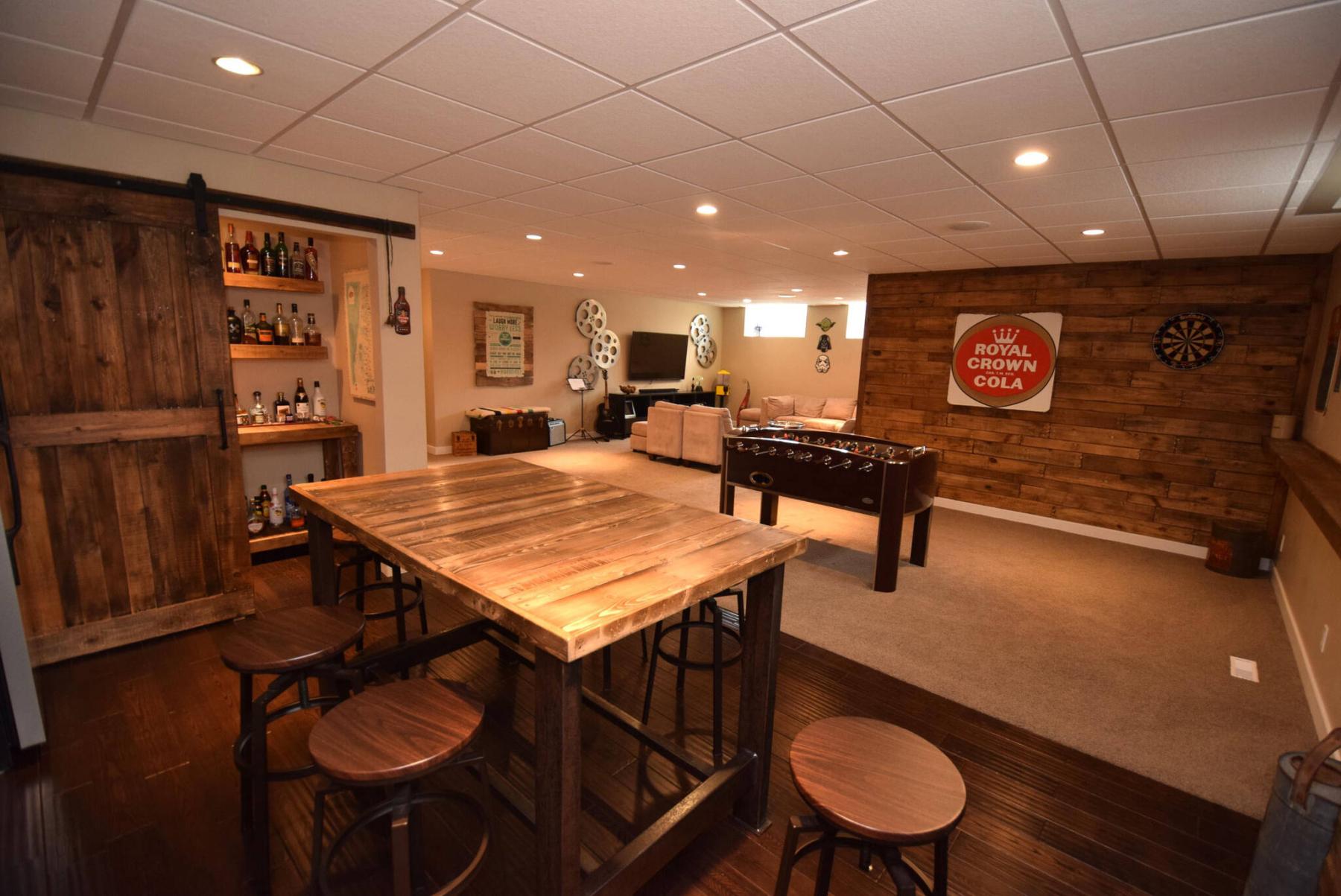 A rustic-modern marvel, the beautifully finished lower-level rec room features a sitting/board games area with dry bar, games space and media corner.
