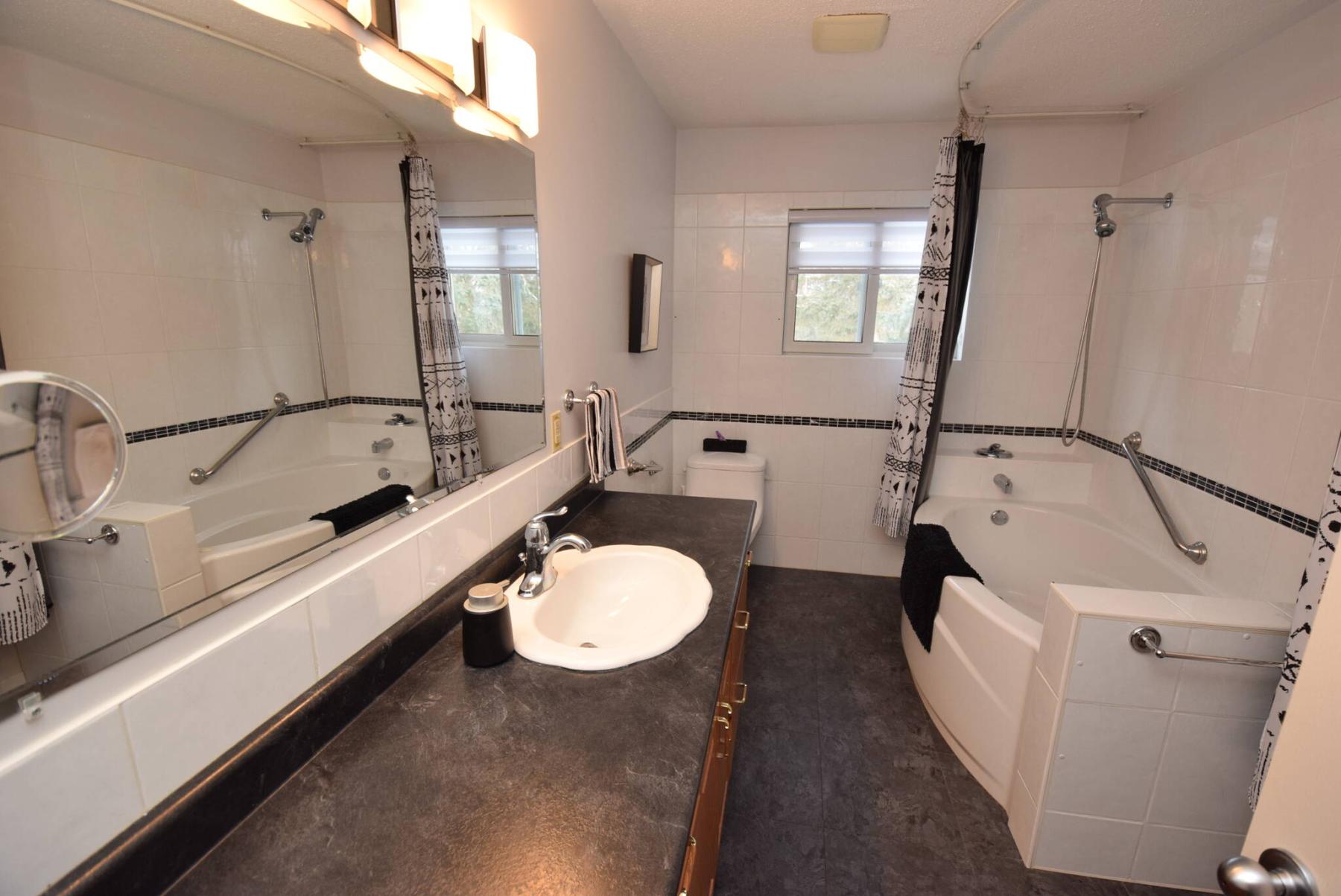 A jetted soaker tub set in a white tile surround highlights the spacious main bath.