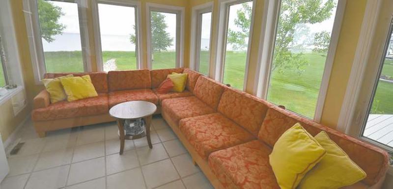 "You could also just head into the sunroom to sit on the couch with a hot beverage and enjoy the view. There's also a covered porch out front where you can sit and take in the golf course view, too."