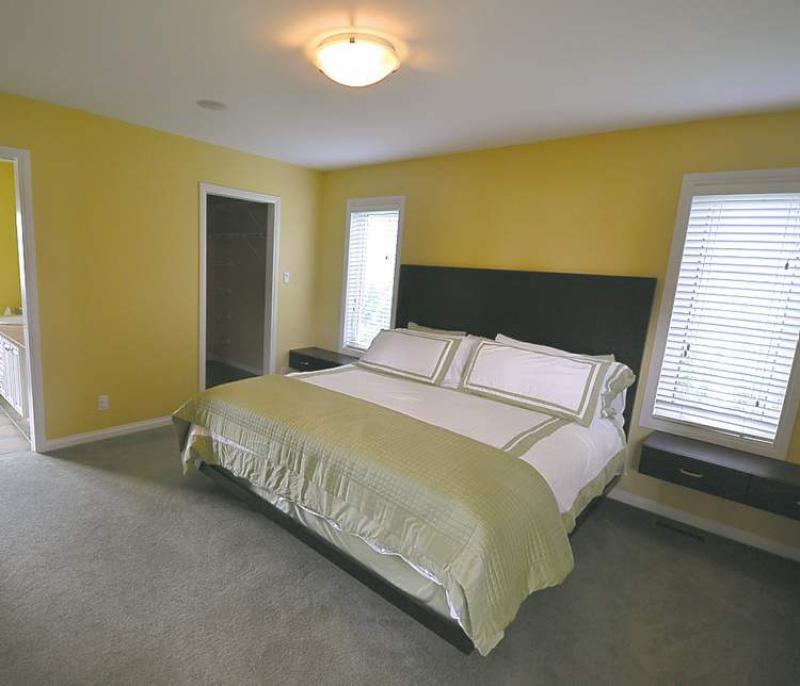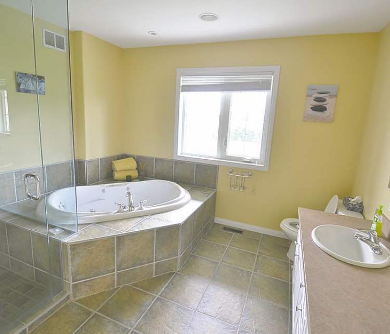 "The den could be made into a fourth bedroom, and the master suite is just a beautiful space. The bed is framed on either side by two huge windows, and there's a luxurious ensuite with a jetted tub set in mocha tile (same as the floor), and tempered glass/tile steam shower. A big walk-in closet gives you plenty of space to store your wardrobe."