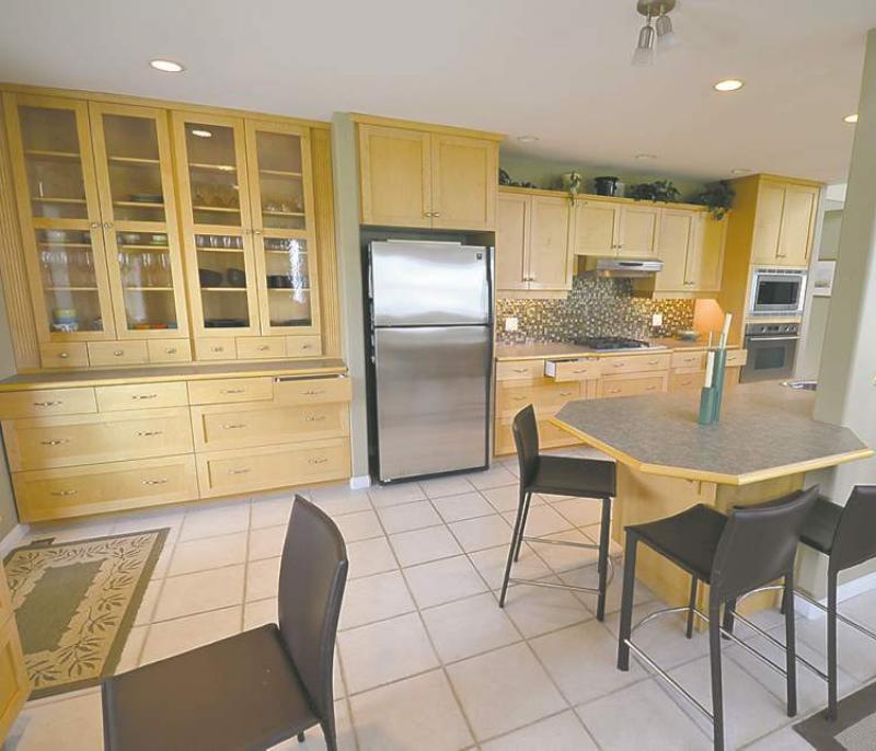 Beneath the same soaring ceiling is the adjacent dining room, which is surrounded by glass -- deck doors, and two huge three-piece windows. It easily holds a table for six to eight, while the galley-style kitchen is stylish and functional with an abundance of natural maple cabinets, tan tile floor and burgundy/moss green/tan glass tile backsplash. An eating nook for three, built-in desk and built-in buffet provide function.