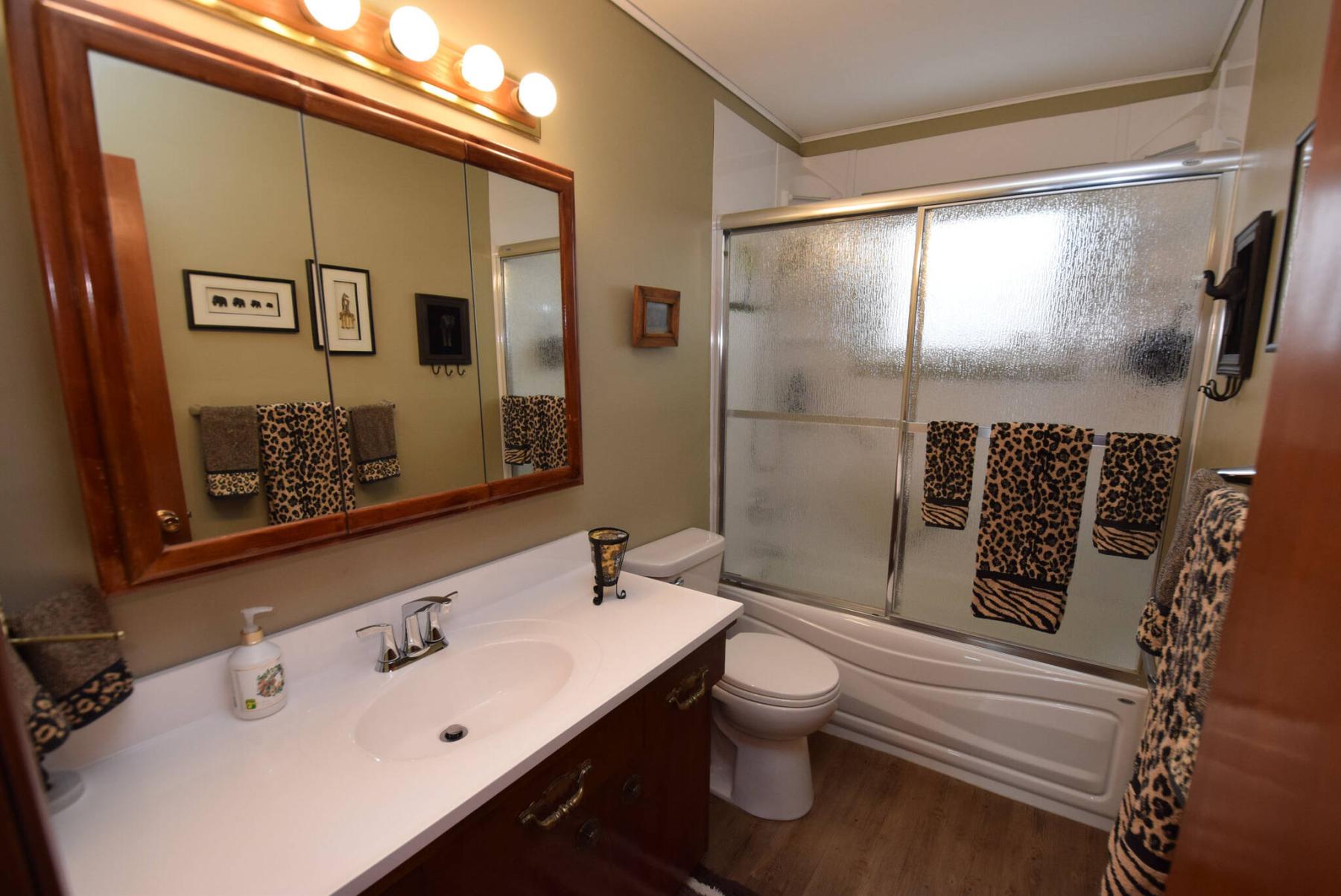 The main bathroom was tastefully updated with a soaker tub, laminate-plank floor and new vanity countertop.