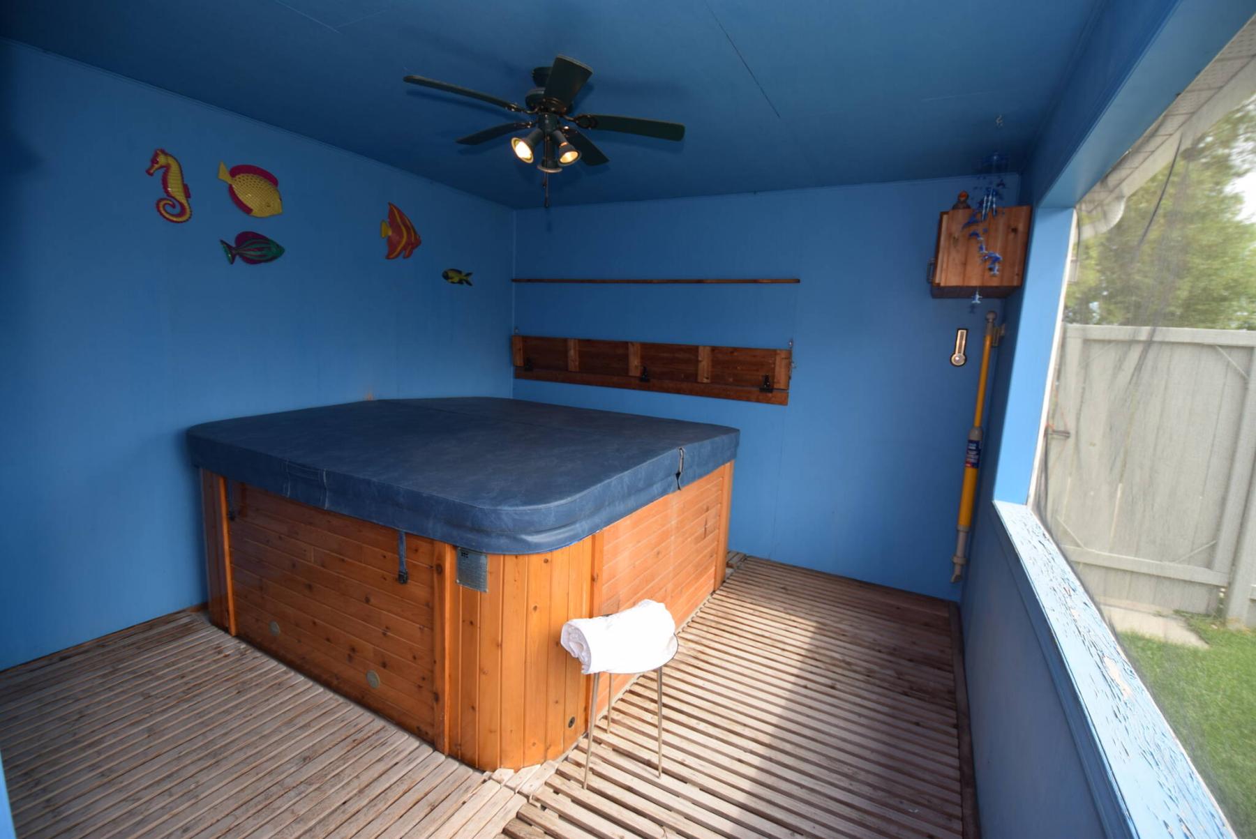 A backyard sunroom with sitting area comes with a screened-in hot tub room.
