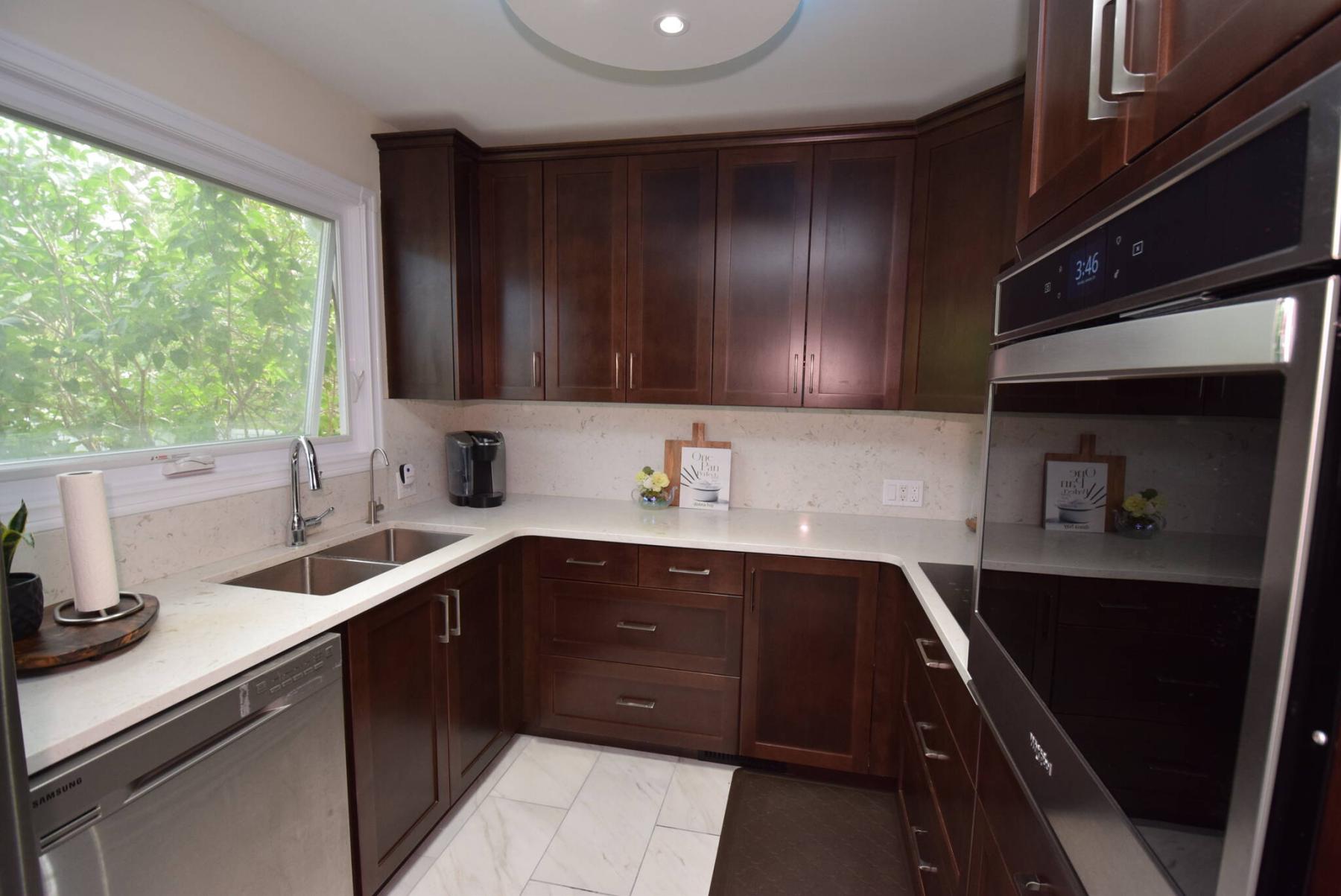 “It was redone with cappuccino maple cabinets, quartz countertops, a matching quartz backsplash and stainless appliances including a built-in oven. There’s also a built-in induction cooktop, too. And the dinette area is amazing with its backyard view and circular light fixture overhead.”