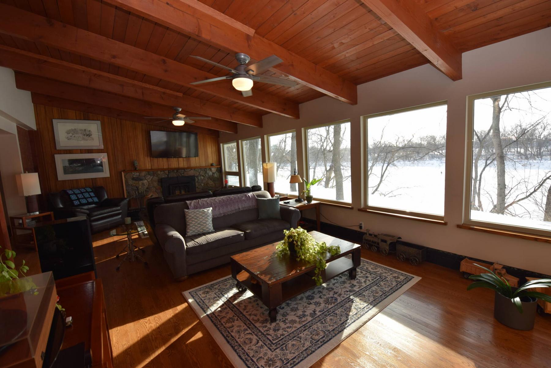 Seven south-facing windows on its rear wall look out over the river and let sunshine in all day long, while a vaulted, beamed ceiling adds character along with a wood burning fireplace set in a stone surround on a weathered wood feature wall, says Bachman. Its an exceptional space.