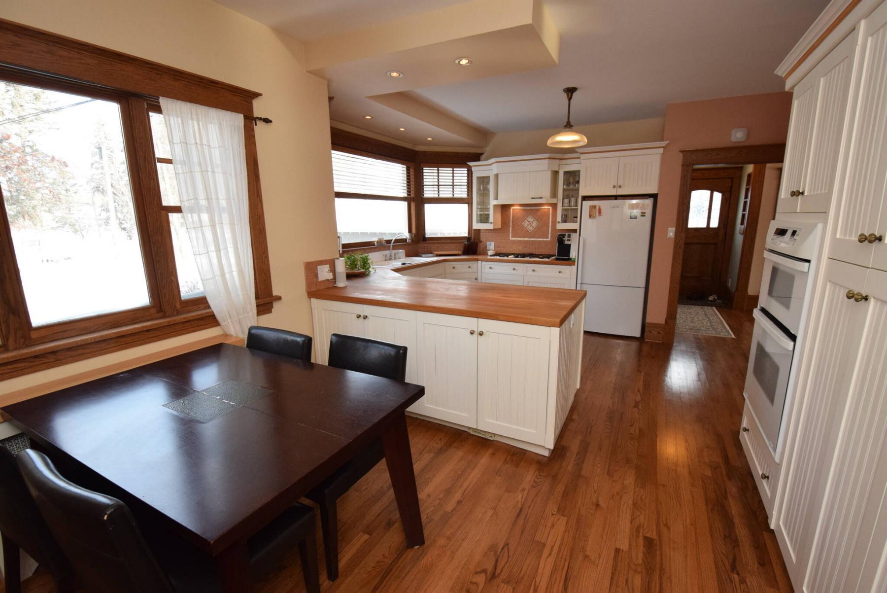 Its perfect for a gourmet with all its space, butcher block countertops, white cupboards, double wall oven, farmhouse sink, huge bay window and informal eating area. Theres also a built-in desk and doorway that leads to a side door.