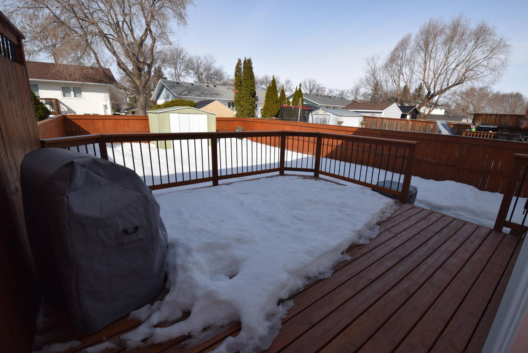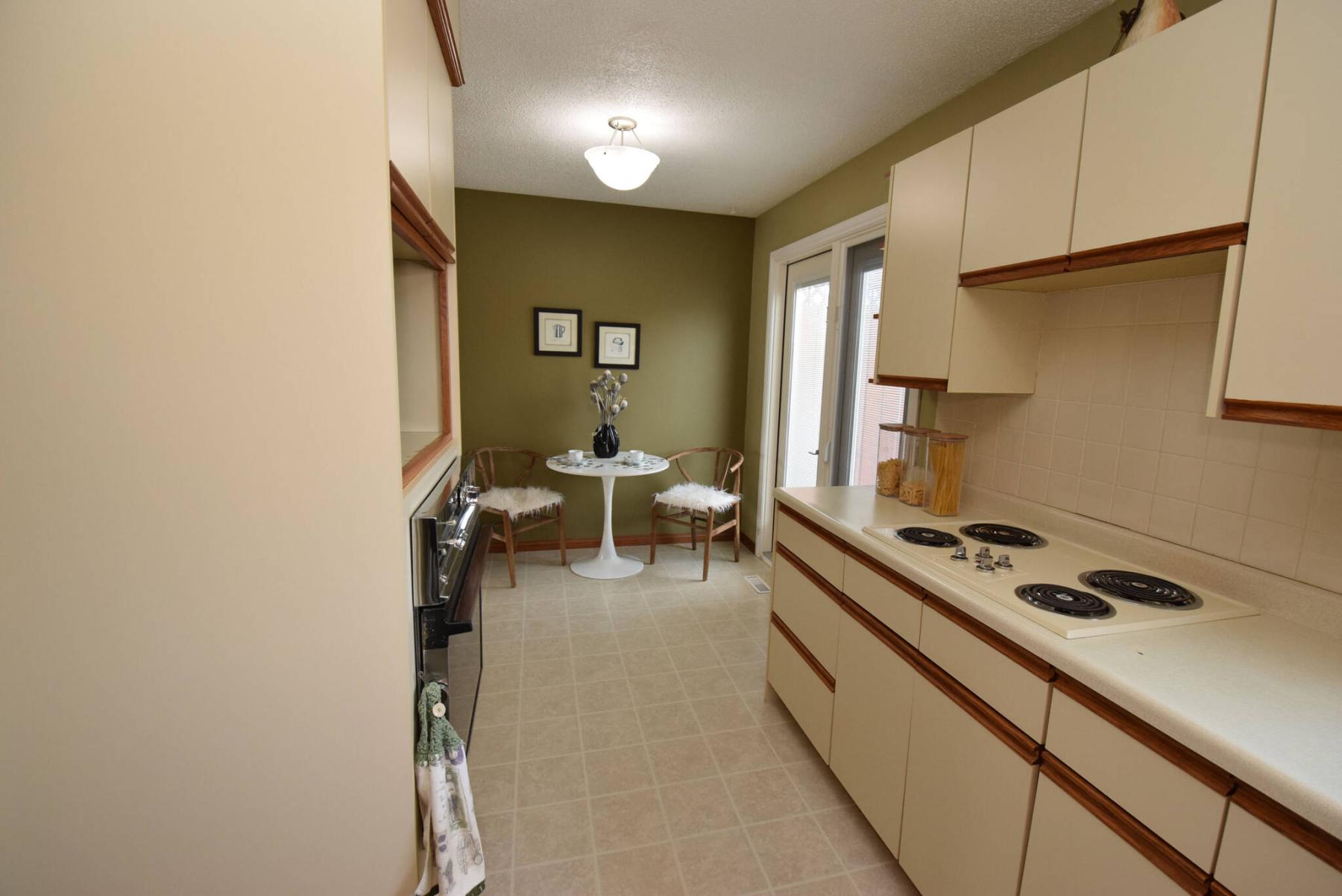 A dining area at the far end of the kitchen is next to a patio door leading out to a large deck that overlooks the fenced backyard.