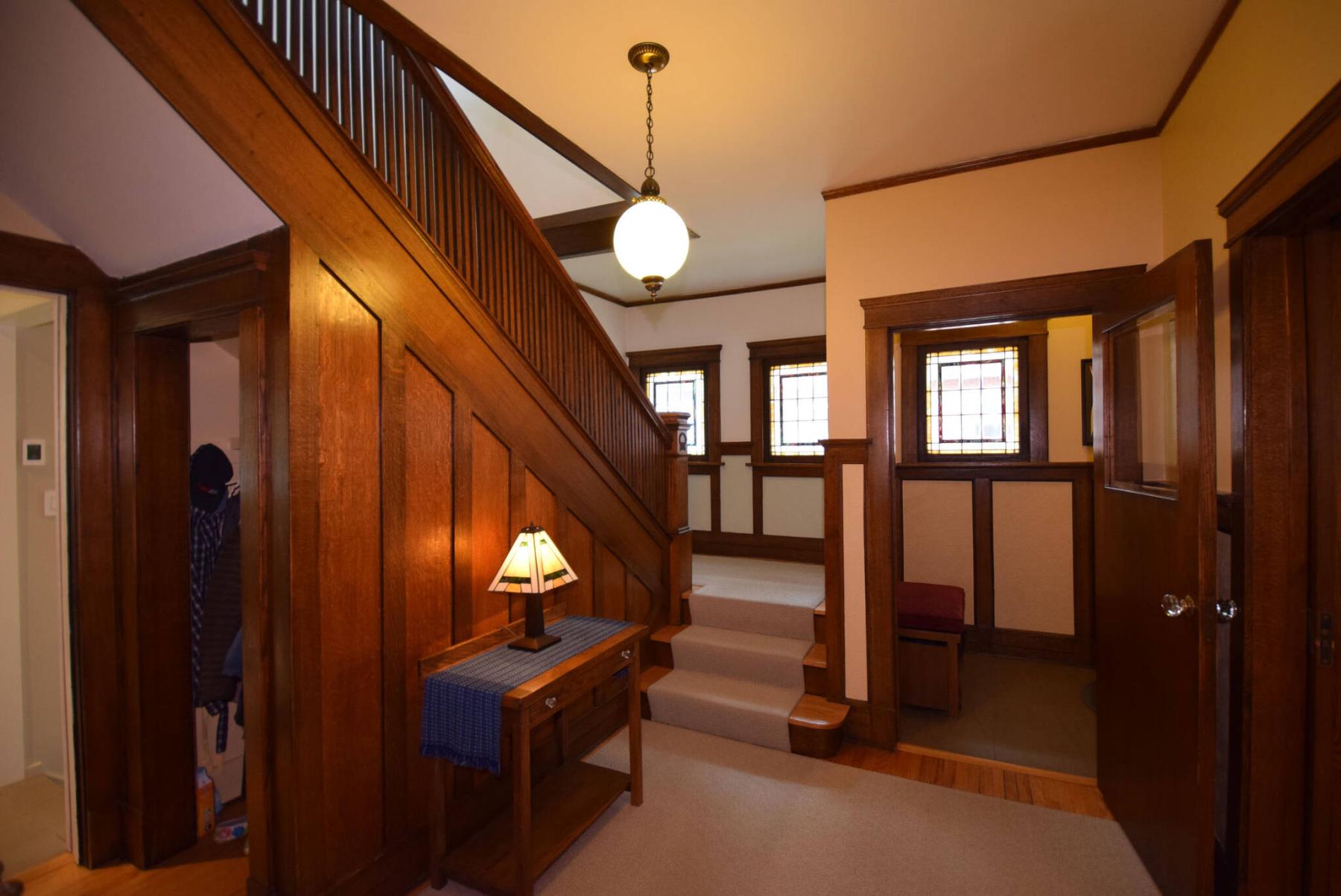 Take the impeccably crafted staircase upstairs past lovely stained-glass windows, and you find the bedrooms and an impressive four-piece bath.
