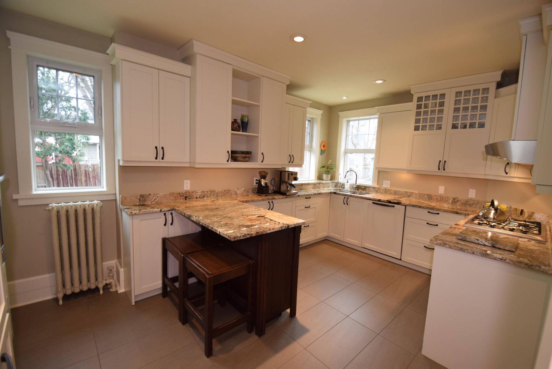 “When the owners moved in, it was dated and lacked functionality,” says Fazekas. “They took out a stairwell to expand it and then upgraded with granite countertops, a stainless-steel wall oven, gas cooktop, eating nook for two and lots of white cabinets, (all melding with) the home’s original character.”