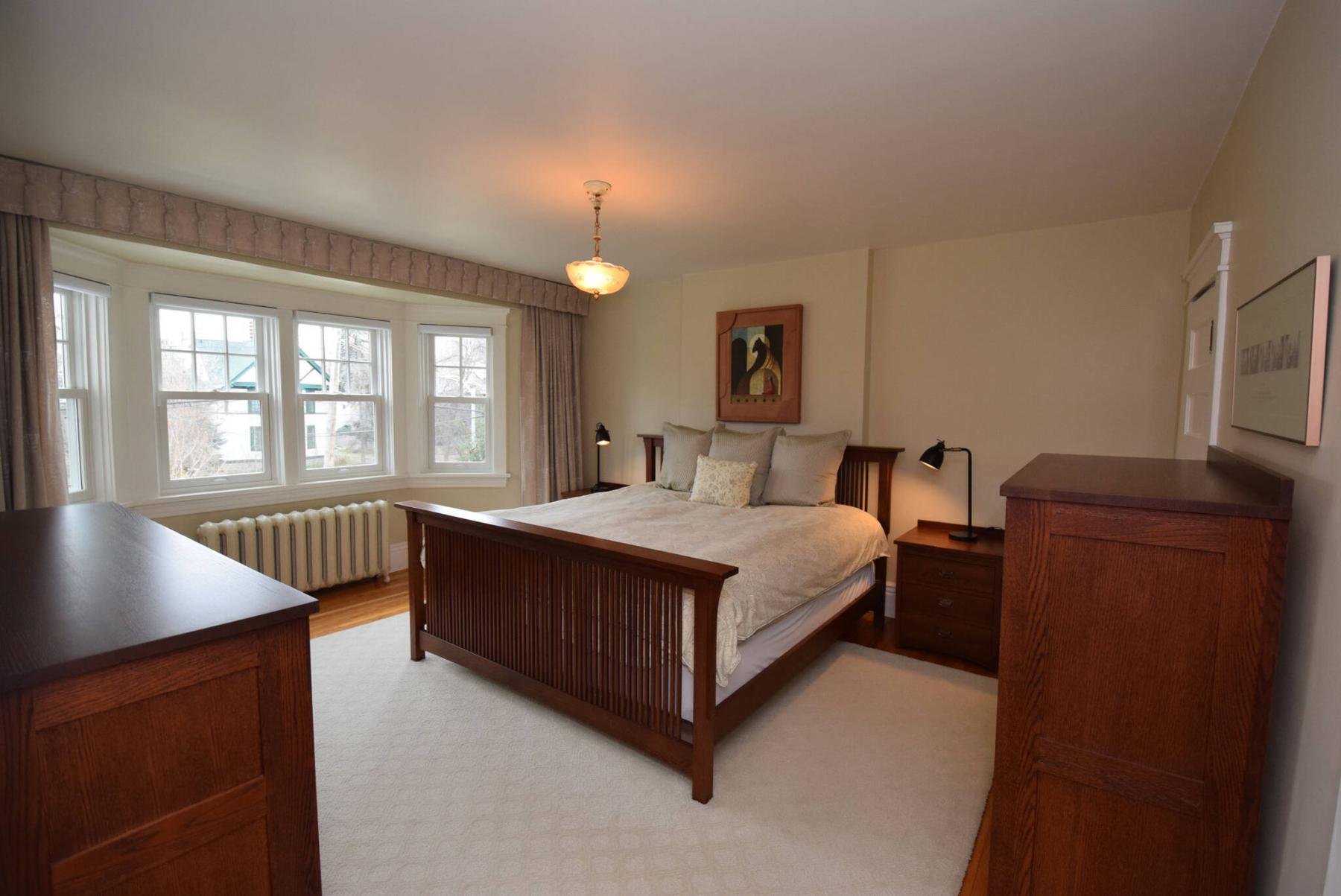 Tons of natural light cascades into the inviting primary bedroom through a huge bay window on its front wall.
