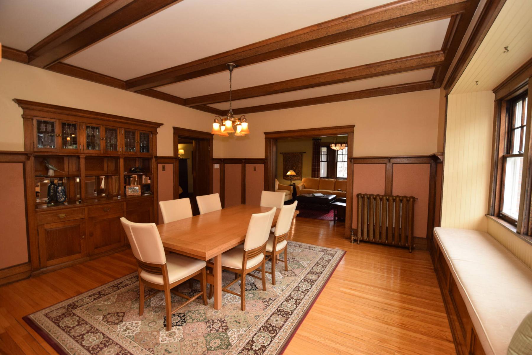 “Every piece of the woodwork is original, from the beamed ceiling to the wainscotting, which is a special embossed wallpaper,” says Fazekas. “There’s also a built-in display cabinet and window seat with beautiful wood trim that’s set next to a three-piece window with more gorgeous woodwork. Even the original pocket doors between the dining room and living room work.”