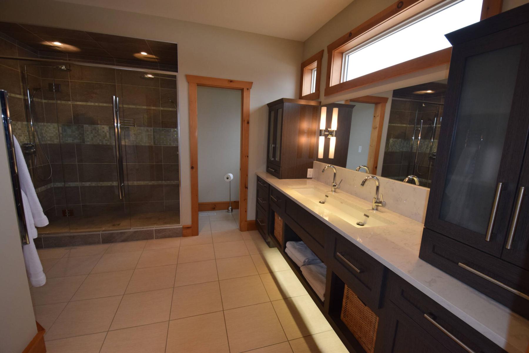 The ensuite that adjoins the main-floor primary bedroom is a spa-like retreat.