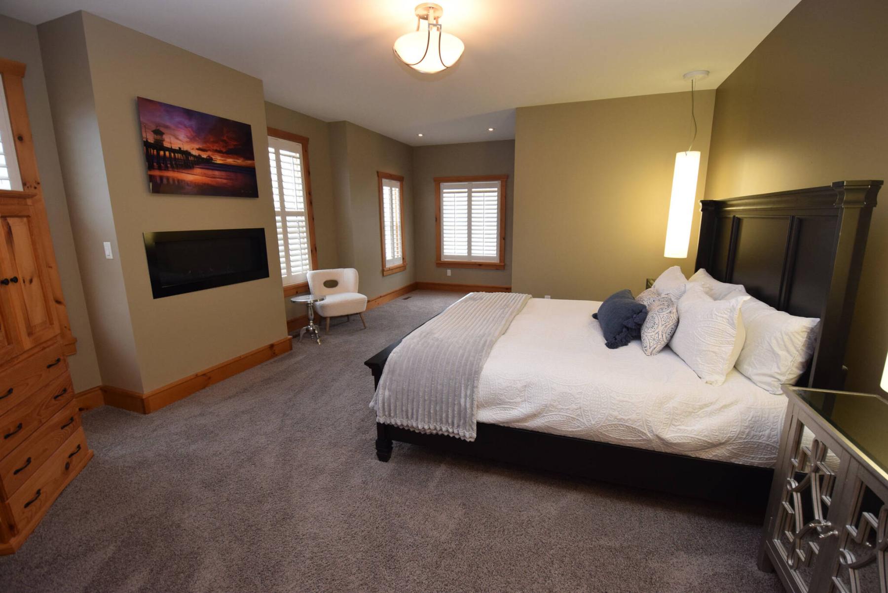 “It starts off with an amazing main-floor primary bedroom,” says MacAngus. “The bedroom is huge, surrounded by windows and has a gas fireplace, and the ensuite is like a spa with its gorgeous, tiled walk-in shower, tile floor, wall-wide, under-lit vanity with dual sinks and tons of storage space and two walk-in closets.”