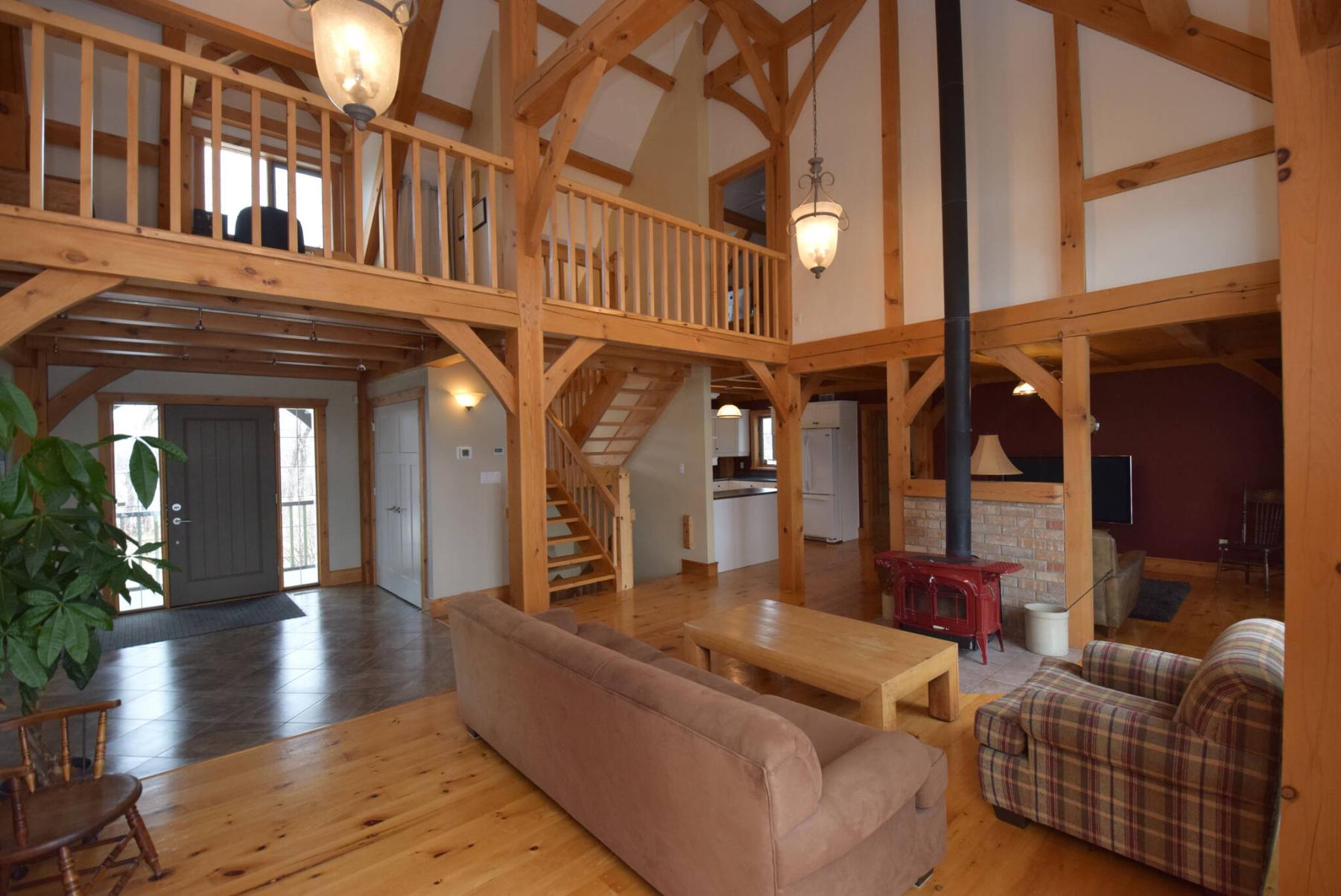 The home starts with a generous, tiled foyer opening onto the original home, and its lodge-like main living area with a magnificent timber-frame design.