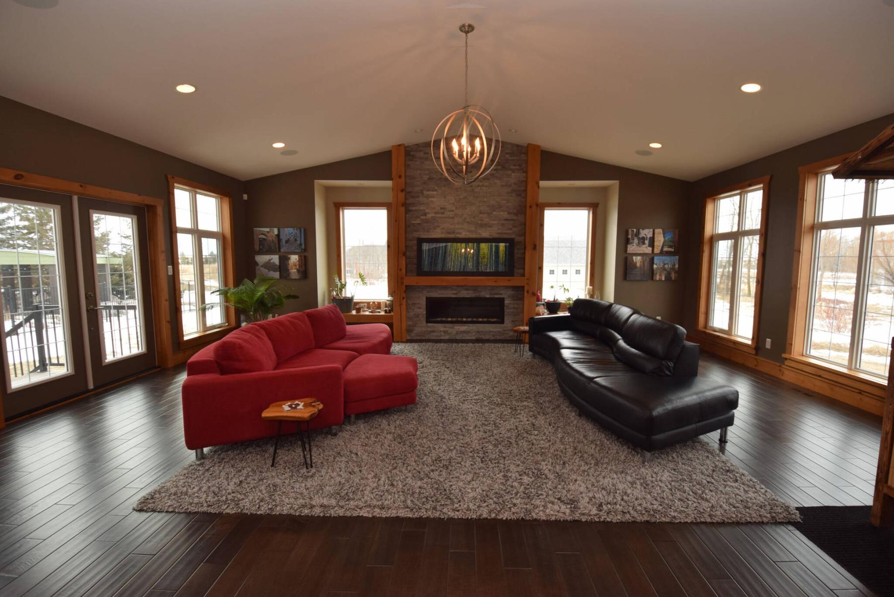 Anchored by a gorgeous, wood-trimmed fireplace with stone backdrop and surrounded by huge windows, the newer home’s great room dazzles with its modern-rustic charm.