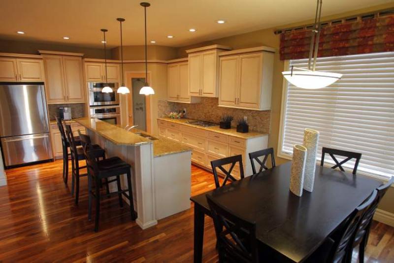 "It's an elegant, functional space with an abundance of custom (colonial) maple cabinetry, walk-in pantry, breakfast bar (for three), tile backsplash and granite countertops," he said. "When the sun's out, it, like the living room, is a bright space, and relaxing at night when the pot lights above bring out the warm walnut hardwoods. The spacious dinette area also offers stunning water vistas."