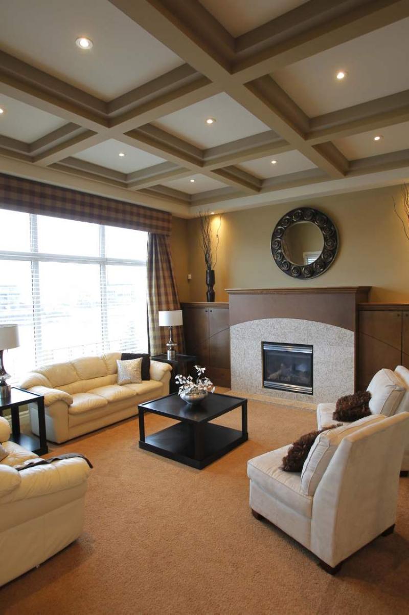 "Its focal point is a gorgeous Tyndall stone and maple gas fireplace that fills the far right-hand wall. That's complemented by a coffered ceiling above that adds even more style. The ceiling is also 12-feet-high, which makes a big space feel even bigger."
