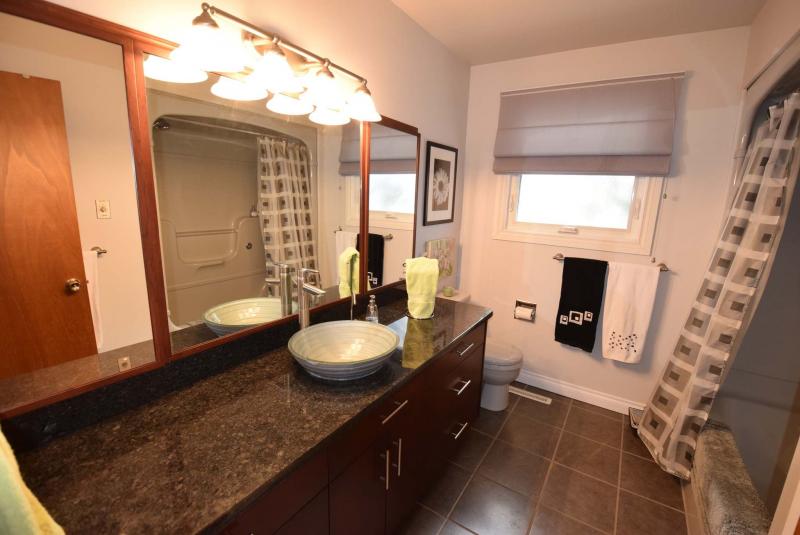 The main level then leads down to the lower level, which contains three spaces: a (21.2-foot-by-12.2-foot) family room/bedroom, good-sized laundry room, and remodelled three-piece bath. While the bathroom is a functional work of art with its tile floor, maple vanity, granite countertop, and five-foot shower, it’s the family room/bedroom that steals the show.