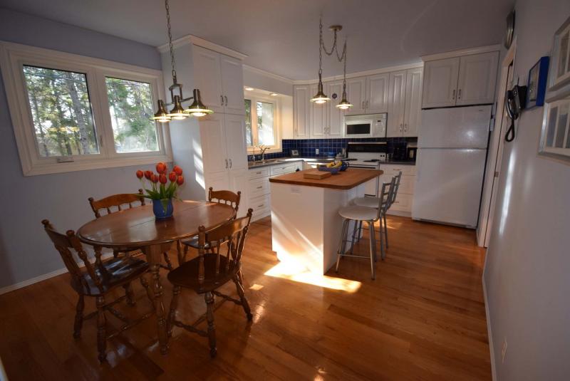 The remodelled, eat-in kitchen features an island with breakfast nook, dinette area for four, white vinyl cabinets and grey countertops.
