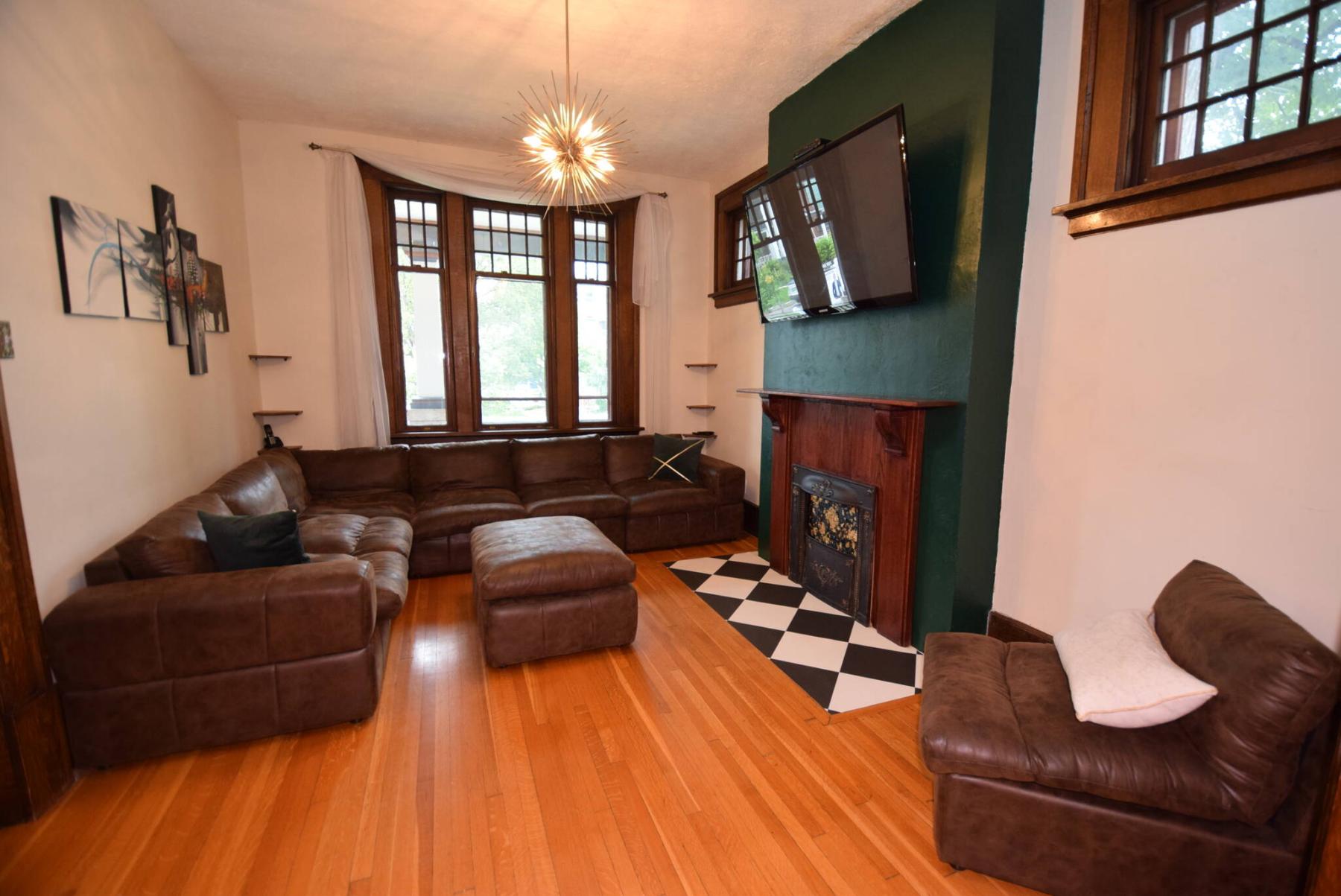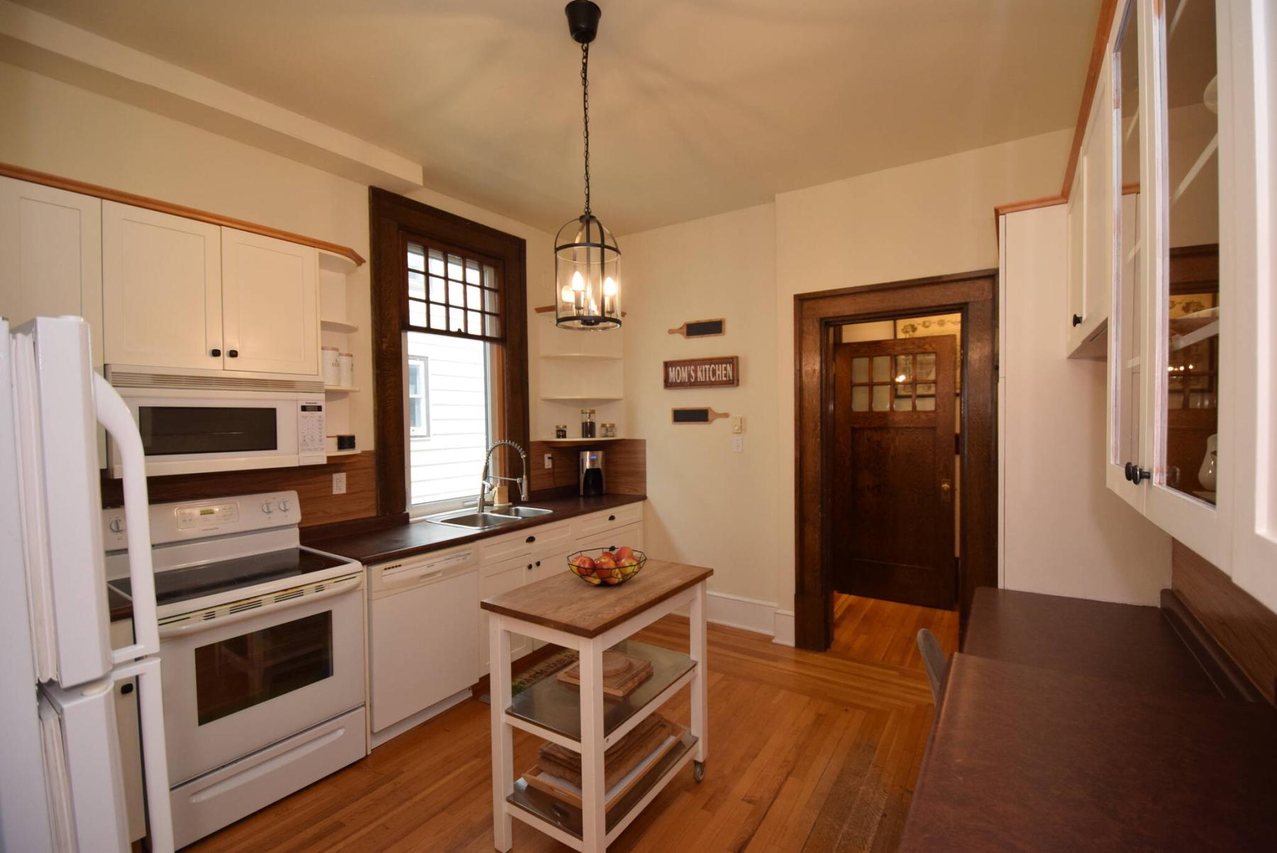 “A double entrance with pocket doors leads into the living room, which offers an ornamental fireplace, original hardwood floors and three windows including a large picture window on its rear wall. Like the picture window, the oak trim on the piano windows on either side of the fireplace is in pristine condition.”