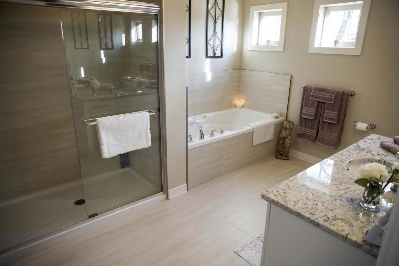 Next comes the main (or guest) bathroom, which is impressive in not one but two senses, said De Leeuw. "It’s finished as beautifully as most ensuites with a (taupe) tile floor, (white) thermofoil vanity with granite countertop and under-mounted sink — and a gorgeous one-piece (vinyl) soaker tub/shower combination with laundry closet beside it."
