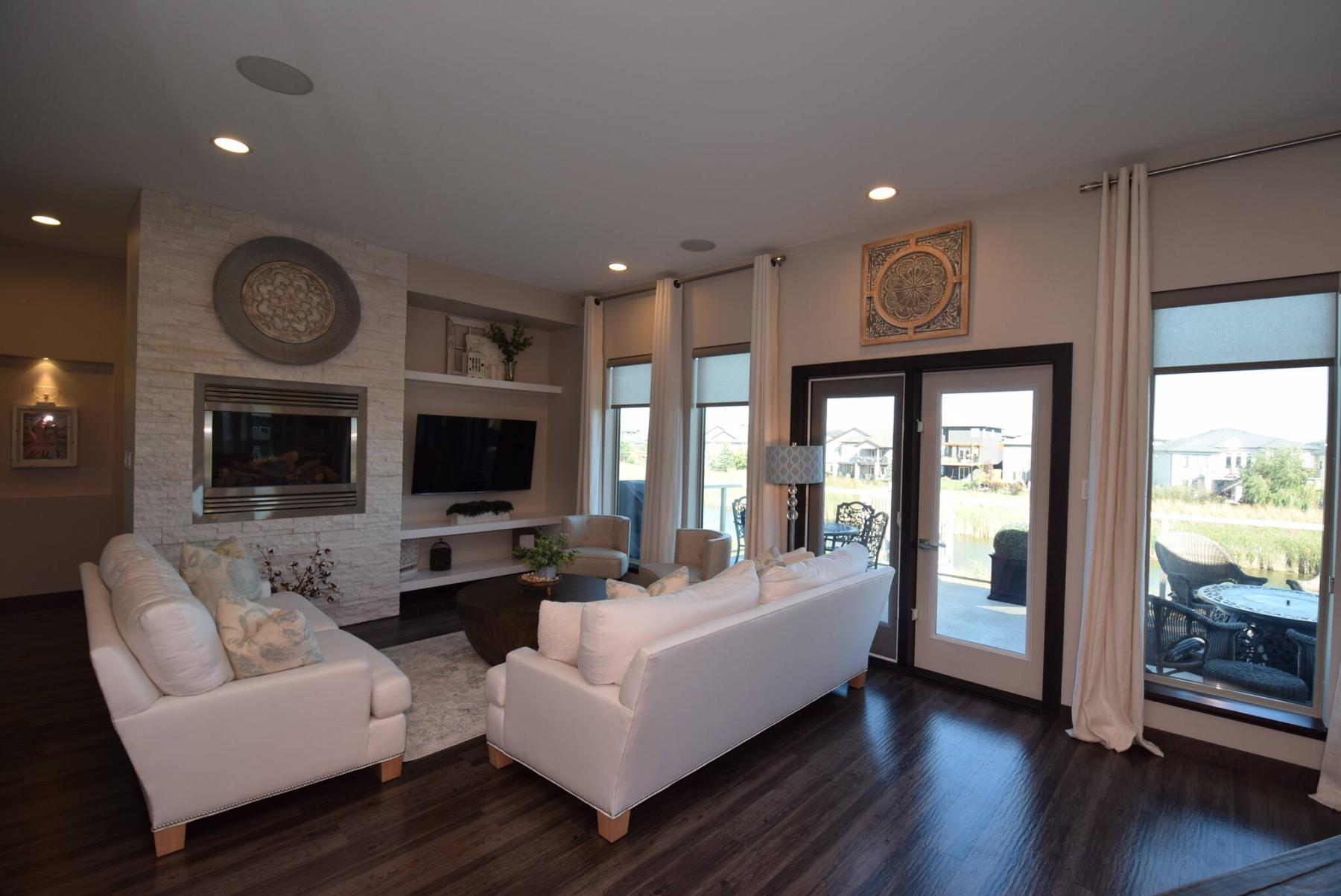 “The open-concept main living area draws you in with all its natural light, which comes from a rear wall that’s filled with large windows,” says Moore. “The first space you see is the living room. Its focal point is a gorgeous gas fireplace with a custom feature wall with built-in shelving units. And the view of the wetlands out back isn’t bad, either.”
