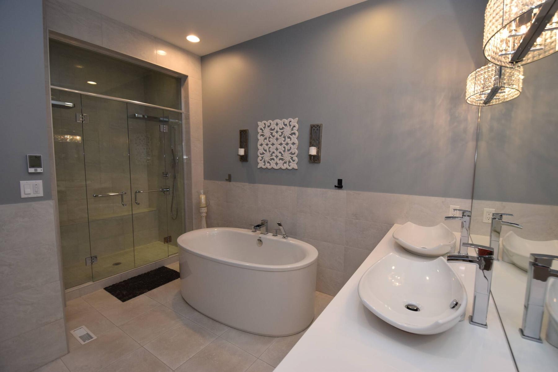 “The ensuite is incredible — it’s like something you’d find at a high-end resort, a spa-like space that caters to your every whim. The walls are lined with tile, the tile floor is heated, and there’s a huge, freestanding soaker tub and awesome walk-in shower with tile surround and dual rainfall shower heads. It’s a luxury-filled retreat.”