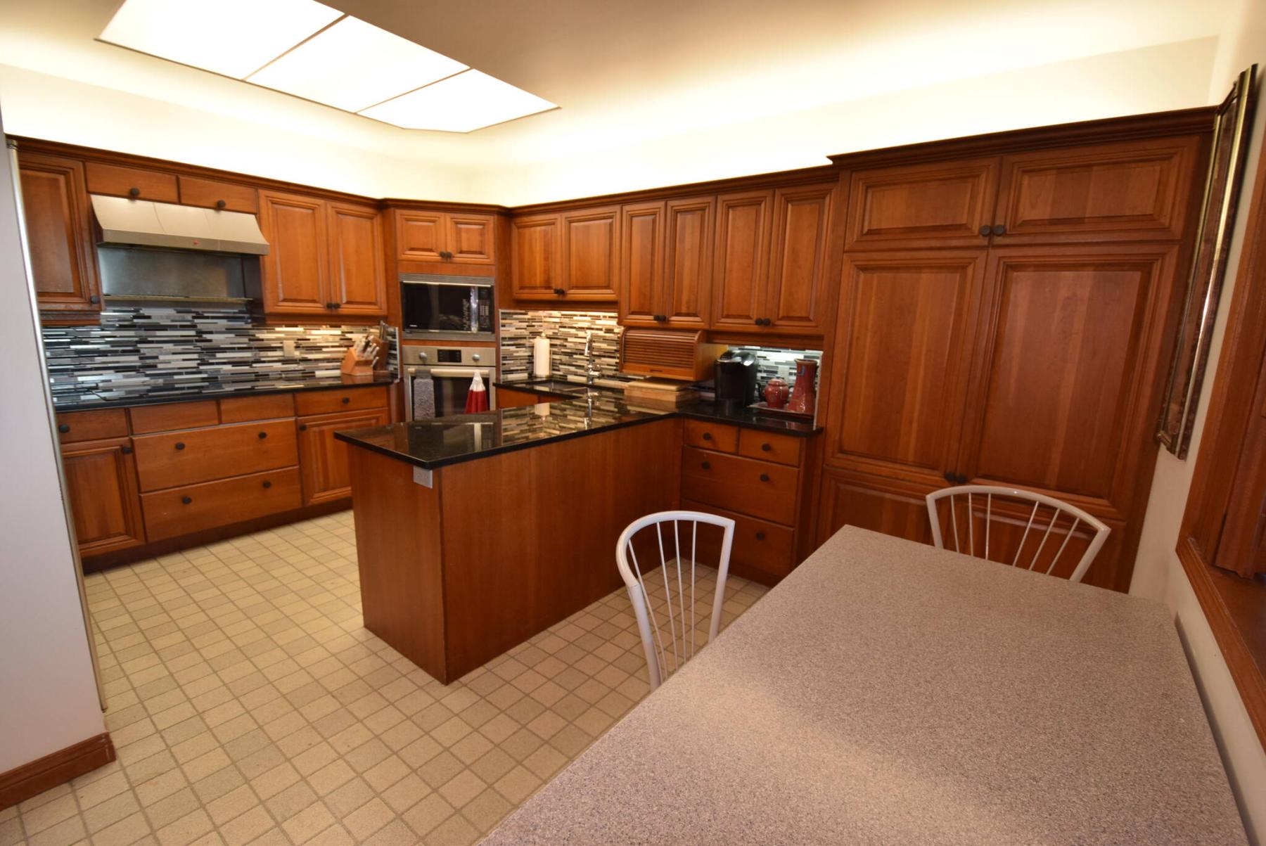 “It was totally redone,” notes Arnason. “First, it was opened up to improve flow and function. Then, it was updated with black granite countertops, gorgeous cabinetry with under cabinet lighting, a tile backsplash, stainless hood fan and high-end appliances including a Sub-Zero fridge and built-in Thermador cooktop. Its U-shaped interior makes it very functional.”