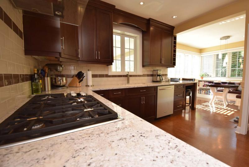 "The kitchen features espresso maple cabinets, gorgeous granite countertops, a glass tile backsplash and cork flooring. It’s finished off perfectly by a built-in gas range and stainless steel appliances."