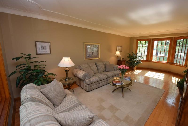 The living room, thanks to an ultra-wide entrance, merges seamlessly into another expansive area that holds a formal dining room and sitting area with huge picture window plus a sunroom off to the side.