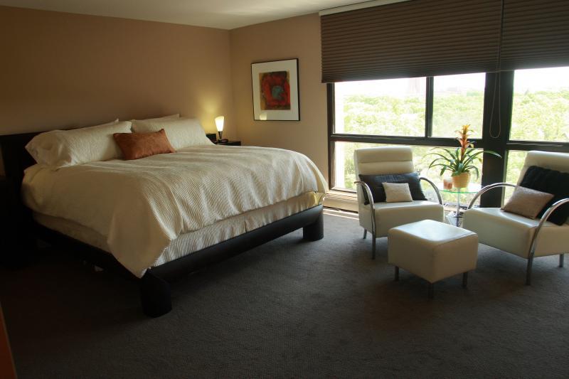 Although the condominium was given a total facelift, a pair of previously-existing attributes remain: the floor-to-ceiling windows in the master bedroom and living room. By opening up the unit and going with earth tone finishing materials -- plus the Zebra wood veneer to add a welcome infusion of pop -- a well-located condominium that once offered little more than superb city vistas has been given a fresh new lease on life.