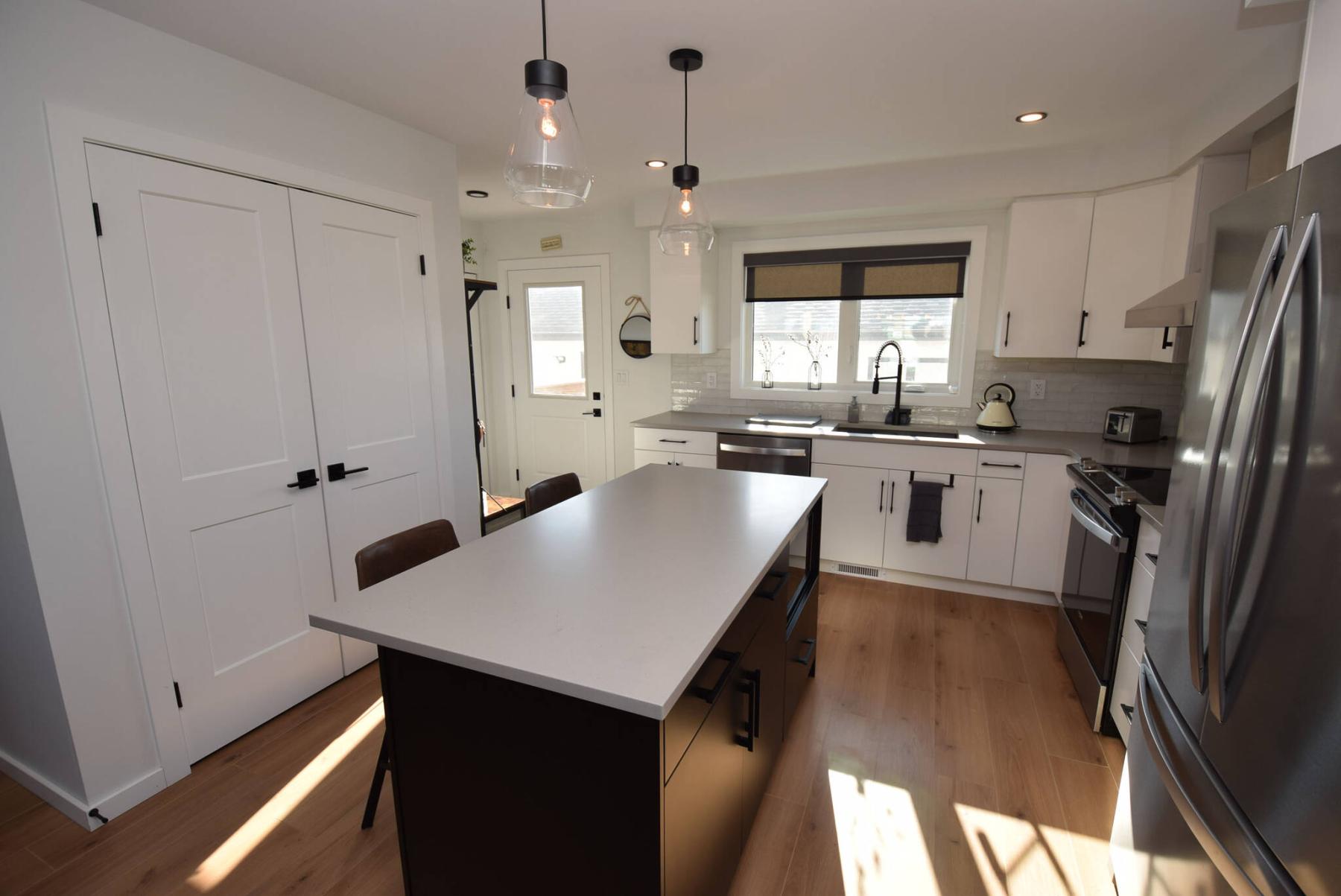 “Not only do you get gorgeous wide-plank flooring, but you also get a kitchen that’s as modern as they come with matte-grey quartz countertops, white cabinets, tile backsplash, contrasting island with breakfast nook for two, newer stainless-steel appliances and a large pantry directly across from the island,” she says. “And there’s also a back door to the left of the sink.”