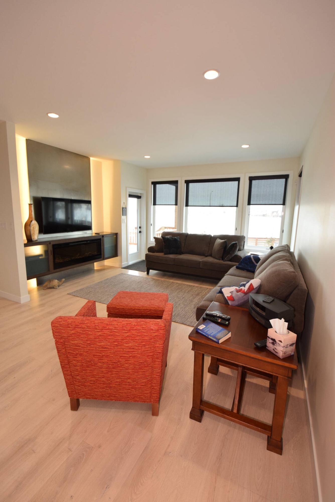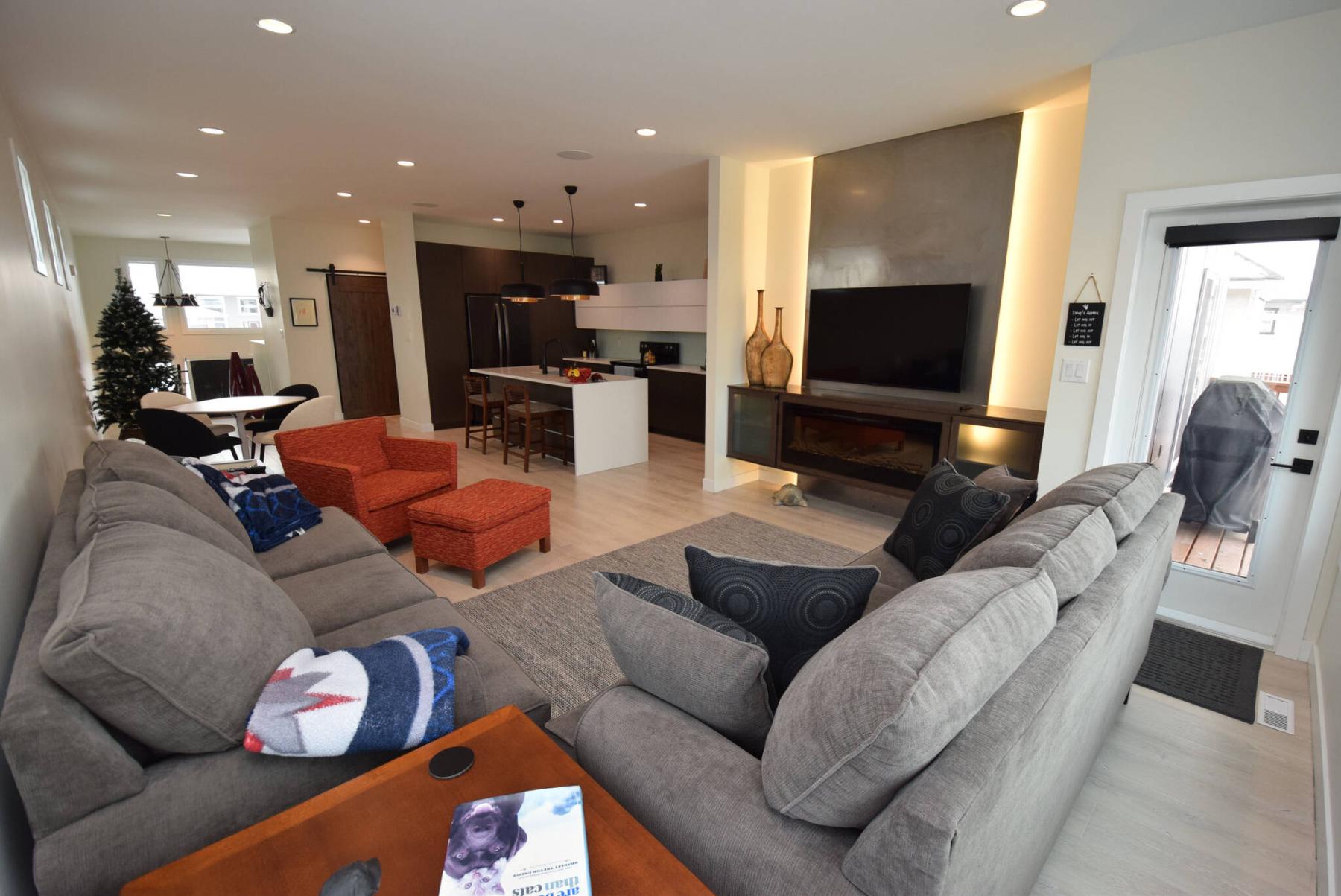 “The large, tri-pane windows provide plenty of warm, natural light, while a patio door on the side wall leads out to a huge, covered deck that overlooks the green space and park behind the home. And the backlit entertainment centre, with its linear electric fireplace and faux-textured feature wall is gorgeous.”