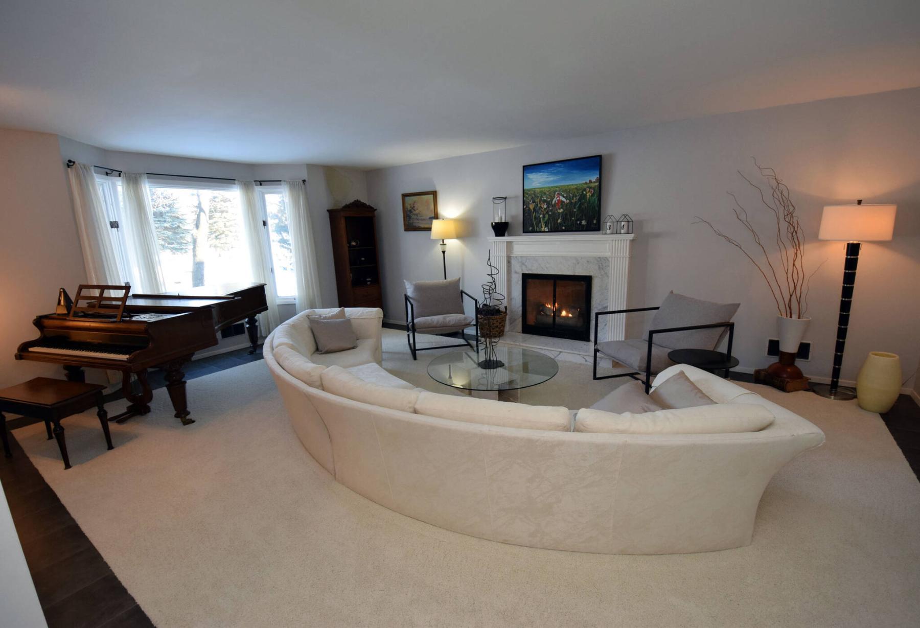 A gas fireplace with elegant marble surround serves as the focal point of the stylish formal living room.