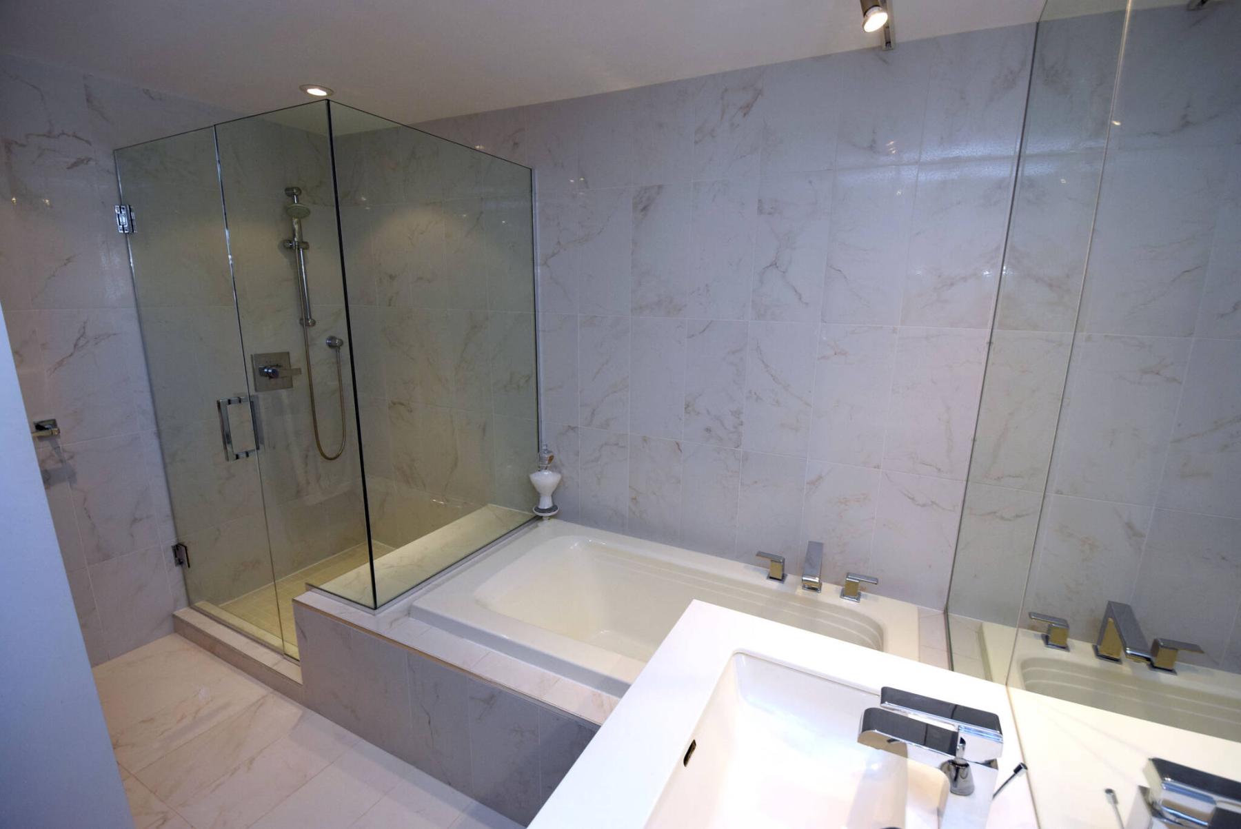 “The well-appointed ensuite offers a soaker tub and walk-in shower that share the same tile feature wall and a heated tile floor.”