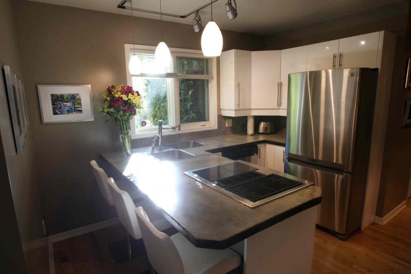 “Then, there are the updates — white thermofoil cabinets (a wealth of them), grey cement countertops and backsplash, and Miele and Jenn-Air appliances.
