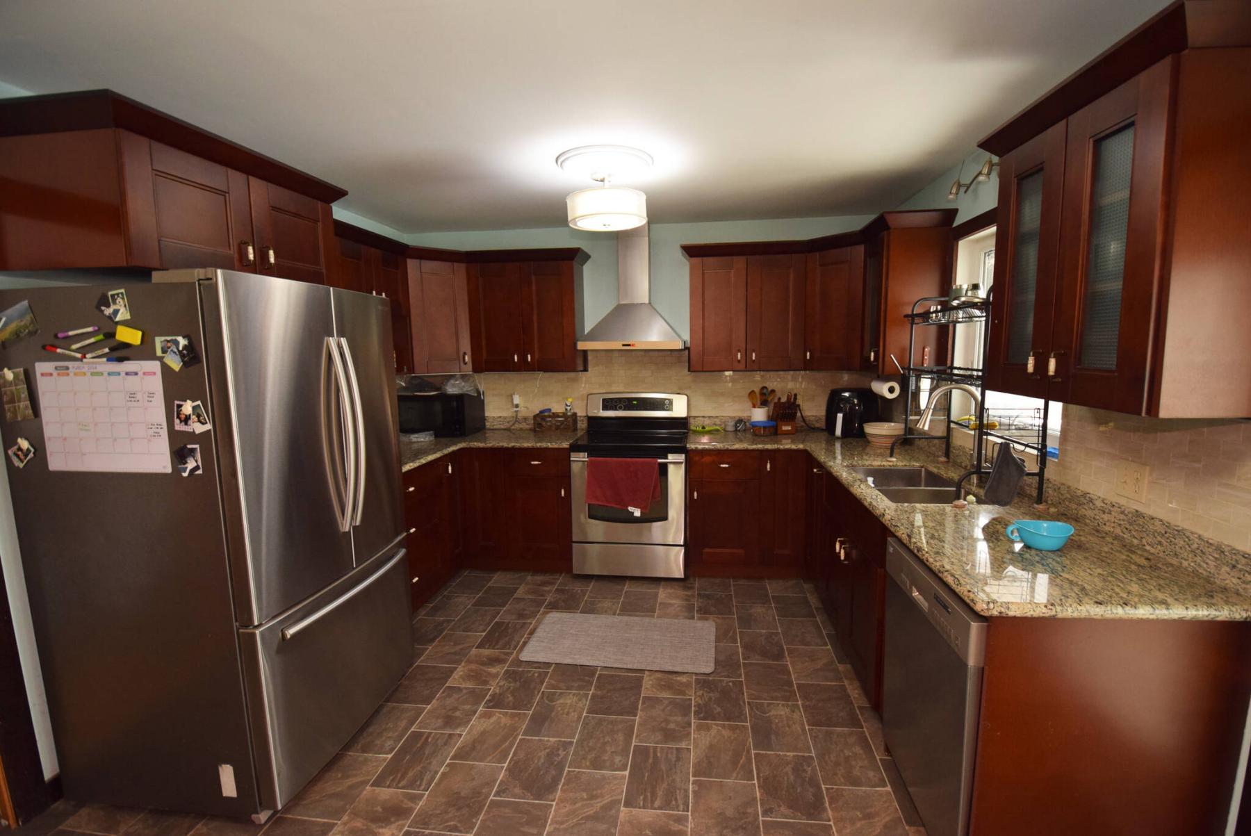 The fresh kitchen offers cherry cabinets, granite countertops, a tile backsplash and newer stainless appliances.