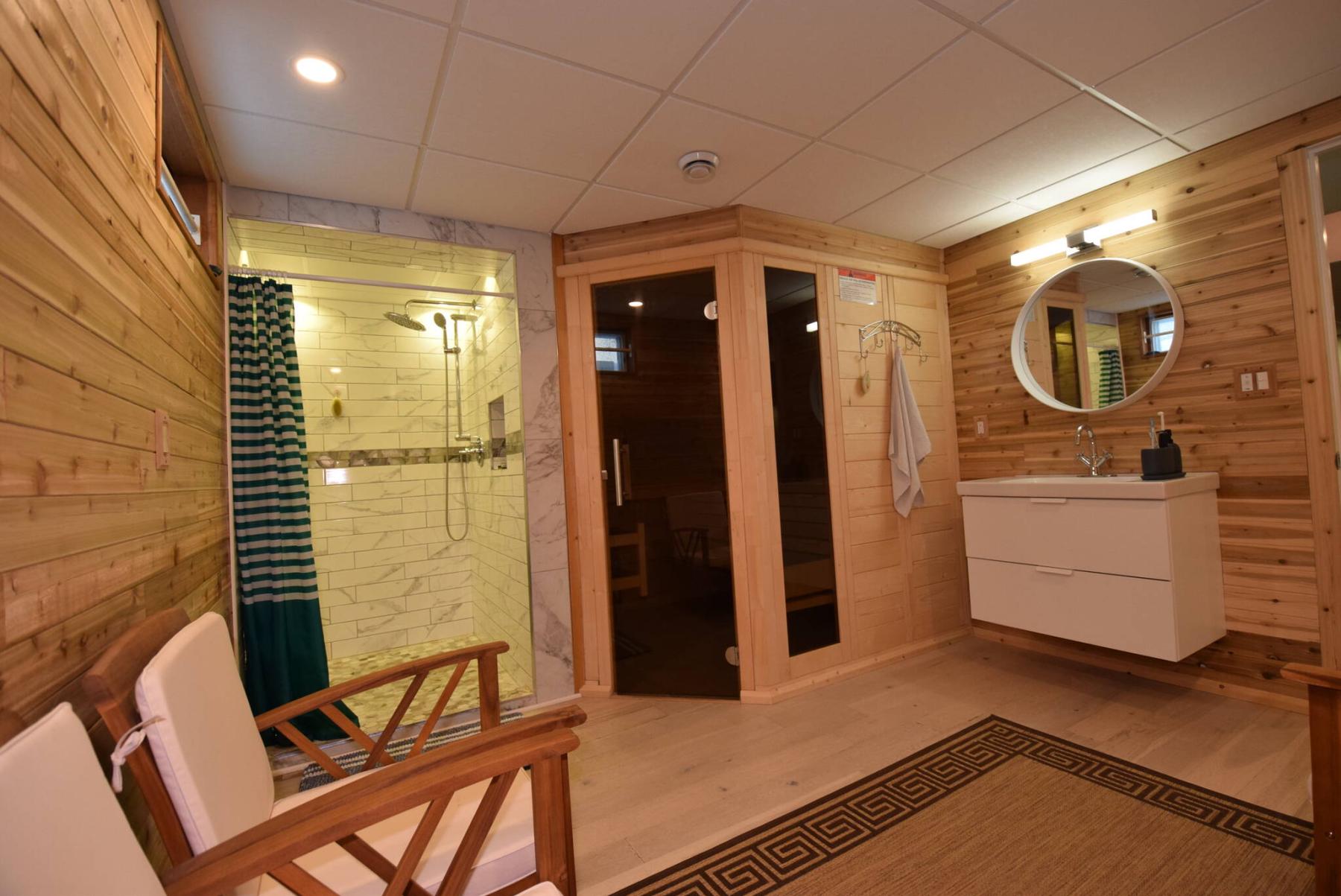 The Nordic-inspired lower level spa has a walk-in shower and a sauna.