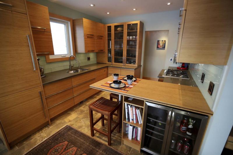 The kitchen is fully custom, including bamboo cabinets and special facades on the appliances.
