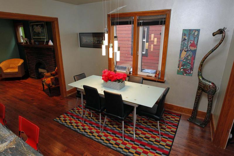 From there, a five-foot-wide oak-trimmed doorway provides seamless access to the dining room, kitchen and a four-season sunroom. The dining room is surprisingly large and can hold a table for six to eight (or more) with ease.