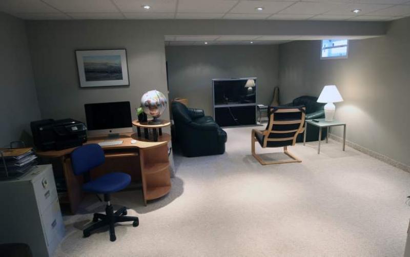 It's also a home grown-ups will appreciate, especially on the main level. Although the home was built 28 years ago, the main floor's design open and contemporary. An eat-in kitchen is deftly divided from the dining room/living room area by a (dark) oak-capped one-third wall (formerly a full wall); the adjacent dining room, meanwhile, holds a table for six next to a large window.