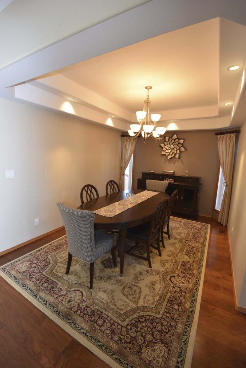 A wide, angled foyer with mocha tile floor opens on to a landing area that’s a feast for the eyes: a formal living room with bevelled tray ceiling to the left, and a spacious formal dining room (also with tray ceiling) to the right.