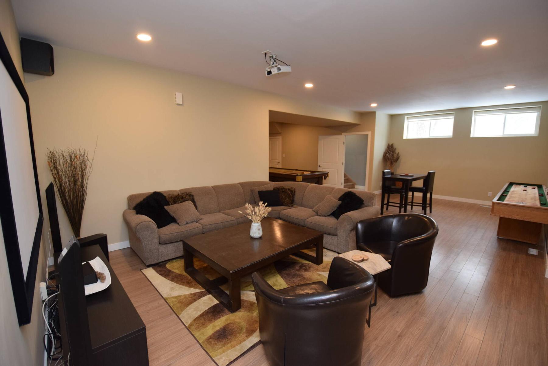 A pair of large windows allows lots of natural light to flow into the huge rec room, which offers a media area and games areas.