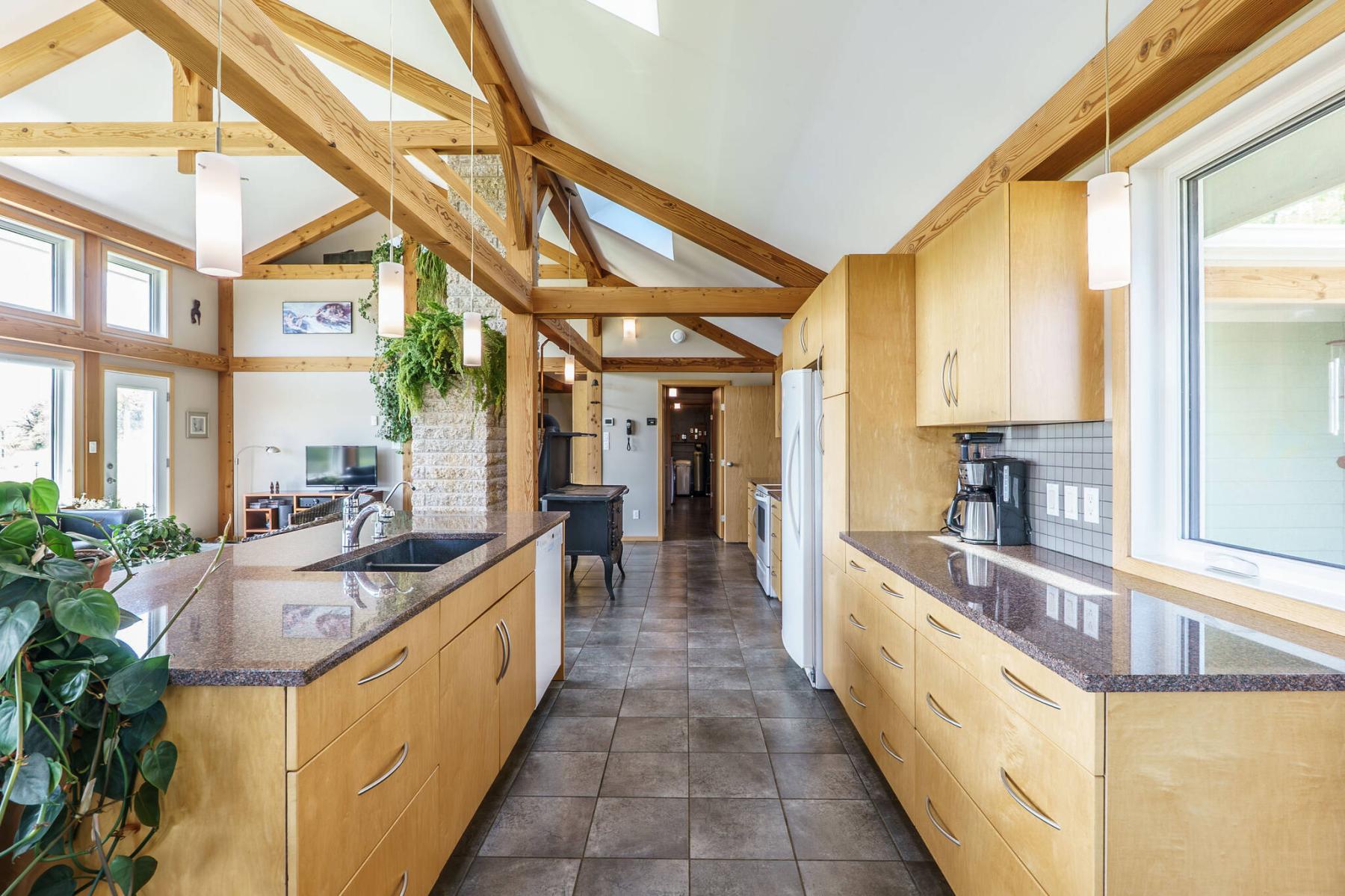 “The open concept layout features an island kitchen with Manitoba granite countertops, a ton of natural cabinets, a tile backsplash and a tile floor. Gorgeous timber frame pillars and beams, along with a Rumford fireplace set in an awesome stone surround, give the main living area an inviting, rustic feel. And the panoramic valley views are incredible.”