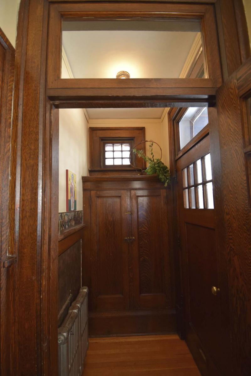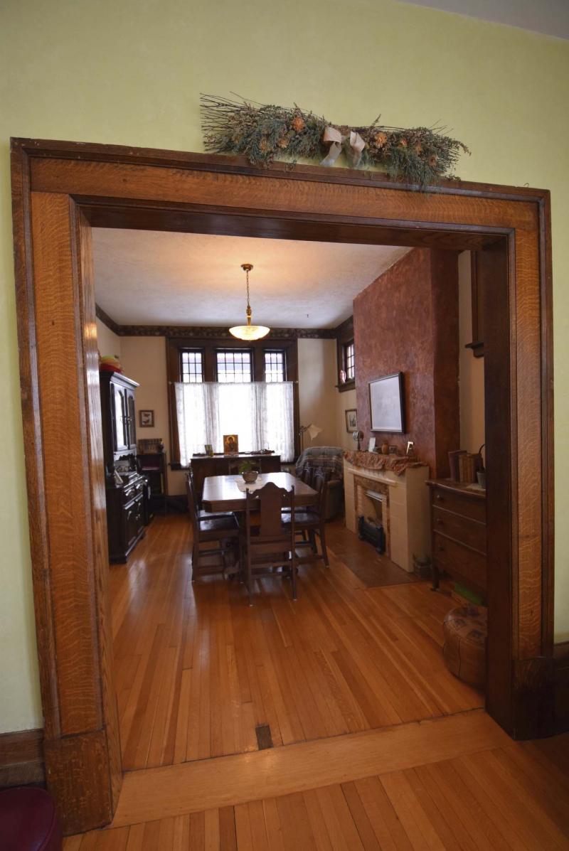 "Step inside, and there’s an original oak staircase with hand-carved oak bannister to the right. To the left, there’s a doorway that leads to the formal dining room that can be closed off by a pair of well-preserved original pocket doors. The other woodwork — door trim, high baseboards and wainscotting — is also in wonderful shape."