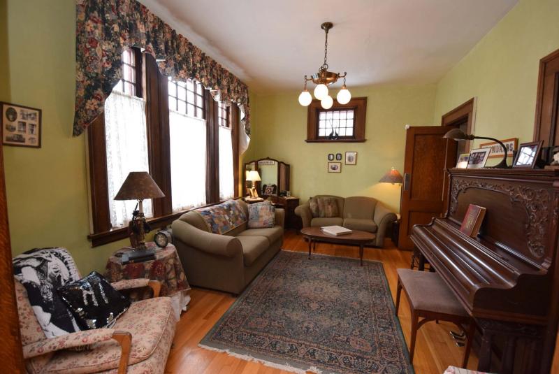 Although a compact space, it serves as a spectacular prelude to the home with its ornate oak coat closet, intricate oak woodwork, latticed piano window and doorway featuring beautiful oak trim and a transom window above to let in light from the front door.