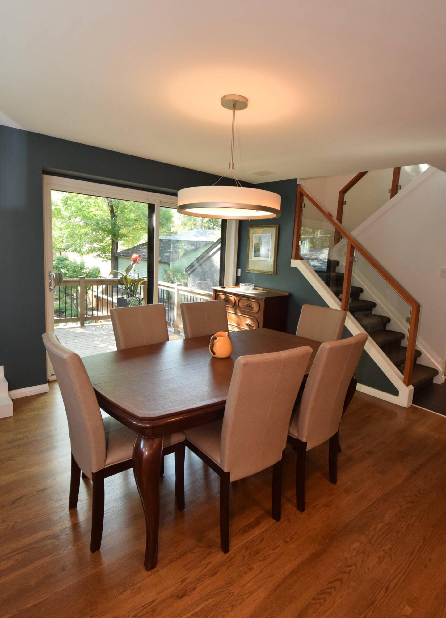 The spacious dining area (which is subtly defined by a mod chandelier) is between the kitchen and a patio door that leads out to a picturesque backyard.